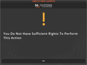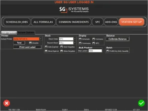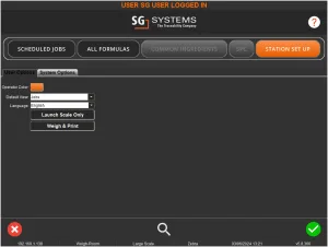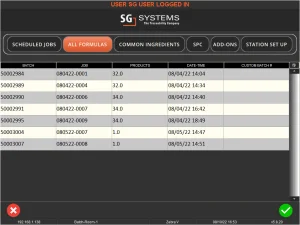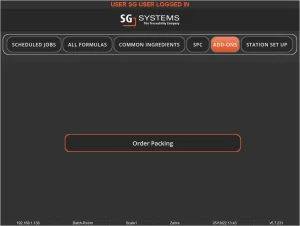 Dieses Nachrichtenbanner zeigt dem Bediener verschiedene Nachrichten an, während er verschiedene Aufgaben ausführt. Neben der Bestätigung der Anmeldung, wie im obigen Beispiel, zeigt das Banner auch Meldungen zum Abschluss der Charge an, wenn eine bestimmte Charge von Zutaten veraltet ist, wenn eine Gewichtsstufe außerhalb der Toleranz liegt usw. Durch Klicken auf das Banner wird eine Liste der vorherigen angezeigt Nachrichten werden angezeigt und Sie werden auch aufgefordert, bei neuen Nachrichten erneut zu scrollen. Diese Laufschrift kann auf Wunsch des SG-Supports deaktiviert werden.