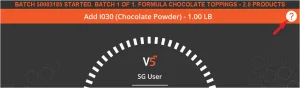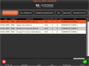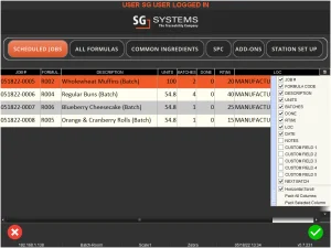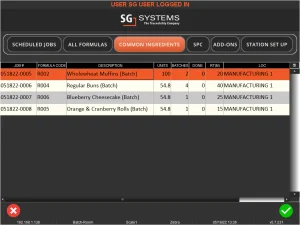 Der Bediener kann dann einen aktiven geplanten Auftrag auswählen und auf die grüne Häkchen-Schaltfläche klicken. Sie werden dann zum üblichen Batch-Produktionsbildschirm weitergeleitet. Der Hauptunterschied besteht hier darin, dass der Bediener bei jedem Schritt aufgefordert wird, Zutaten in Gruppen zu wiegen, abhängig von der zugewiesenen Blockgröße.