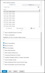 Ubicaciones de existencias – Nos permite especificar ubicaciones de stock a partir de los cuales recurrir para cumplir con los requisitos de los trabajos seleccionados. Es útil que algunas ubicaciones puedan contener stock negativo.