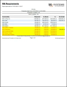 El informe 'Requisitos de RM' se puede utilizar para generar un informe que enumere los requisitos de materia prima para la producción.