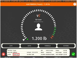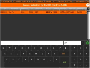 Si noti che la modalità "AUTO" del Terminale deve essere abilitata affinché il lotto venga selezionato automaticamente, altrimenti il Terminale mostrerà solo lo stock assegnato che possiamo selezionare nella normale schermata di selezione del lotto, come possiamo vedere qui per il prossimo ingrediente (Cal-Pro):