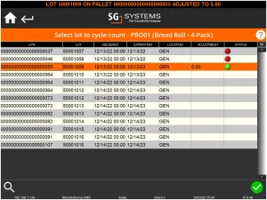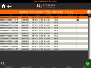 Selezionando "Modalità automatica" nel menu di conteggio ciclo di WMS, verrà automaticamente selezionata una merce da contare e verrà visualizzato l'elenco dei lotti disponibili per l'operatore. In questo caso il sistema ha selezionato il prodotto 'Panino – Confezione da 4'. La spia di stato rossa qui indica un lotto scaduto. Poiché questi lotti sono scaduti, non li conteremo qui e vedremo come gestirli in seguito.