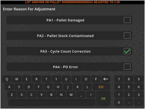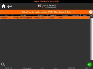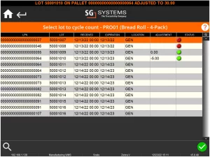 Una volta selezionato un motivo (e se non c'è un'opzione di testo libero, che in questo caso non c'è), torneremo nuovamente alla schermata di selezione del lotto. Anche in questo caso possiamo vedere che il lotto 50001010 ha una spia di stato verde che indica che è stato contato di recente, così come l'aggiustamento effettuato durante l'ultimo conteggio.