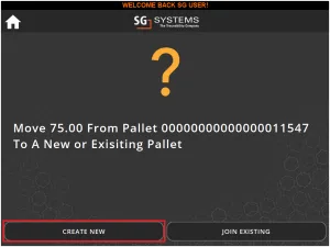 Ci verrà quindi chiesto di scansionare il nostro prossimo pallet in stock di panini da 6 pacchi dalla posizione di STAGING, quando ci verrà nuovamente chiesto di spostare 25 pacchi da questo pallet e ancora se vogliamo crearne uno nuovo o unirci a un pallet esistente per il nostro primo ordine. Qui ci uniremo al pallet che abbiamo creato sopra.