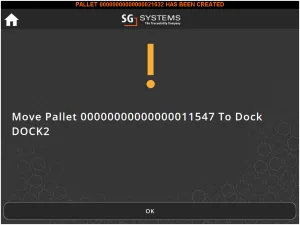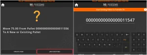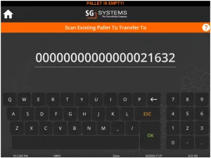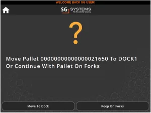 Fatto ciò, il sistema ci chiederà quindi di scansionare lo stesso pallet richiesto originariamente, quindi questa volta lo faremo e quando ci verrà data la stessa opzione di cui sopra per "Spostare sulla banchina" o "Mantieni sulle forche" , questa volta selezioneremo quest'ultimo e manterremo quel pallet sul carrello elevatore.
