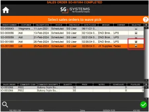 Ci verrà quindi mostrato un elenco degli ordini di vendita attualmente pianificati. Utilizzeremo quindi la casella di controllo "selezionato" (per impostazione predefinita all'estrema destra di questa finestra) per selezionare gli ordini che vogliamo raccogliere.