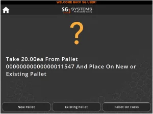 Ci verrà quindi chiesto di scansionare un pallet nella posizione di sosta. Possiamo scegliere uno qualsiasi dei pallet qui e il sistema ci indicherà automaticamente cosa farne.