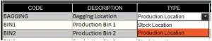생산 위치를 만드는 것은 처음 2개의 열을 채운 다음 여기에 표시된 것처럼 드롭다운 메뉴에서 올바른 위치 유형을 선택하는 것만큼 쉽습니다. 할당된 코드는 고유해야 합니다.