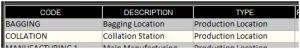 여기 메인 패널에 현재 위치 목록이 표시되며 오른쪽 하단의 녹색 +를 사용하여 위치를 추가할 수 있습니다. 이 예에서는 'BAGGING' 및 'COLLATION'이라는 2개의 새 생산 위치를 생성해 보겠습니다. Bagging은 수식의 개별 요소를 포장하는 데 사용되며, 그런 다음 대조 스테이션에서 다른 상품과 결합됩니다.