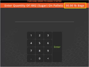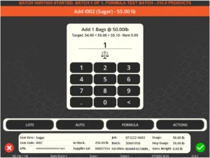Se executarmos uma fórmula de exemplo que requer 55 libras de açúcar, o terminal de pesagem pedirá primeiro 1 saco de açúcar, antes de pedir que as 5 libras restantes sejam pesadas separadamente.