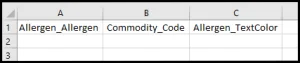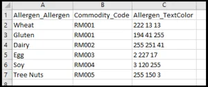 Allergen_TextColor – Позволяет вводить число RGB для назначения цвета группе аллергенов. Обратите внимание, что это должно быть одинаково для всех товаров в одной группе аллергенов. Также обратите внимание, что при импорте цветов с использованием этого метода числа RGB не нужно разделять запятыми (например, 219 125 33 вместо 219, 125, 33).