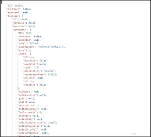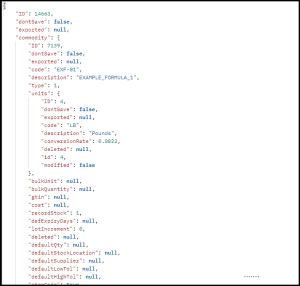 This endpoint will export a JSON file with all related information for a specific formula. If we run this GET request for the formula we created via the ‘Formula’ endpoint, we will get a return file that looks something like this: