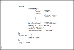 As mentioned above, the ‘StockLocation’ endpoint can be used to insert stock records and their associated locations. However, if we want to update and details for these lots that fall under the ‘Stock’ header, we must use the ‘Stock’ endpoint. This includes details such as the supplier lot number, expiry date and the weight received.