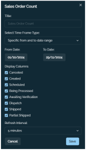 Other KPIs such as the ‘Sales Order Count’, provide more options for what data they will display, such as in this case being able to specify which order statuses we want to see on the KPI. A full breakdown of parameters for each KPI is featured below! In this case let’s use the date filter instead of specifying days in the past: