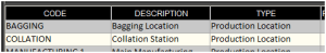 Creating production locations is as easy as filling in the first 2 columns and then selecting the correct location type from the drop-down menu, as seen here. The assigned code must be unique.
