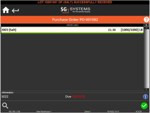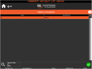 This lot of salt will now be held at ‘Dock 1’, but what happens when we want to move it? Well this can be done easily using the ‘commodities’ section of WMS. If we head to this section, we can either scan the stock barcode of the lot (which will be printed at the end of the PO process) or navigate to it manually/search for the lot number using the built in search options.