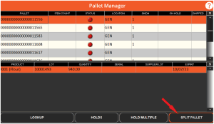 The split pallet function here allows us to move lots (or parts of lots) of a commodity on the pallet to another pallet. To use this, we much have a pallet and a lot of commodity selected.
