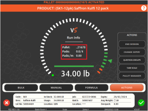 We can then proceed to create our products to complete the order, packing onto this pallet in the process. We can see the correct pallet is now selected in the ‘Run Info’ section in the center of the screen (this view can be accessed by tapping on the user icon if the operator is in that view).