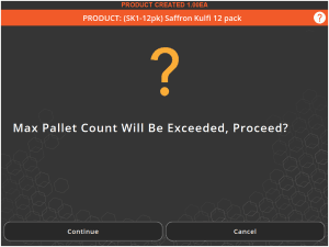 We noted above that when we started this job, the pallet number was red, indicating that it was full for this particular commodity (using the aforementioned ‘Max on Pallet’ setting in ‘Formulas’). If we were to try and pack another product onto this pallet, the operator would be presented with the following warning message.