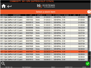 We can add palletized items to sales orders the same way we would for non-palletized or containerized. If we schedule a sales order for the 4 products we made above, we can see that when presented with our list of stock items we can see the lot we just produced. The operator could either select this or scan the pallet label to add it to the order.