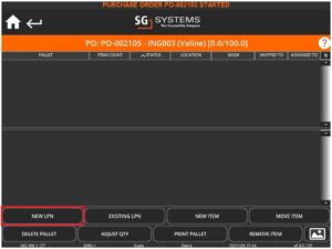 Selecting a line to receive here will, as with receiving regular palletized stock above, show the pallet manager, and as before we can add a ‘New LPN’.