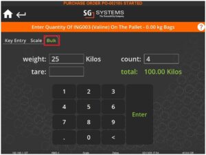 The process here would follow the same steps as above aside from entering 2 pallets when prompted instead of 1. Then, since the containers here are 20kg not 25kg as with the Valine, we can enter this into the bulk screen like so (keep in mind here that we are telling the system what is on each single pallet, not both):