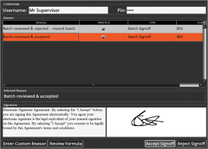 If, for whatever reason, the batch isn’t acceptable, then the supervisor would select the ‘Batch reviewed & rejected – rework batch’ and select ‘Reject Signoff’.