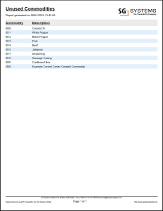 The ‘Unused Commodities’ report can be used to generate a report that lists various types of commodities that are not used in any formulas within the system.