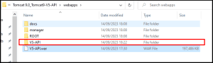 Once placed here, and with the Tomcat service running, a ‘V5-API’ folder will automatically be created alongside the ‘war’ file.